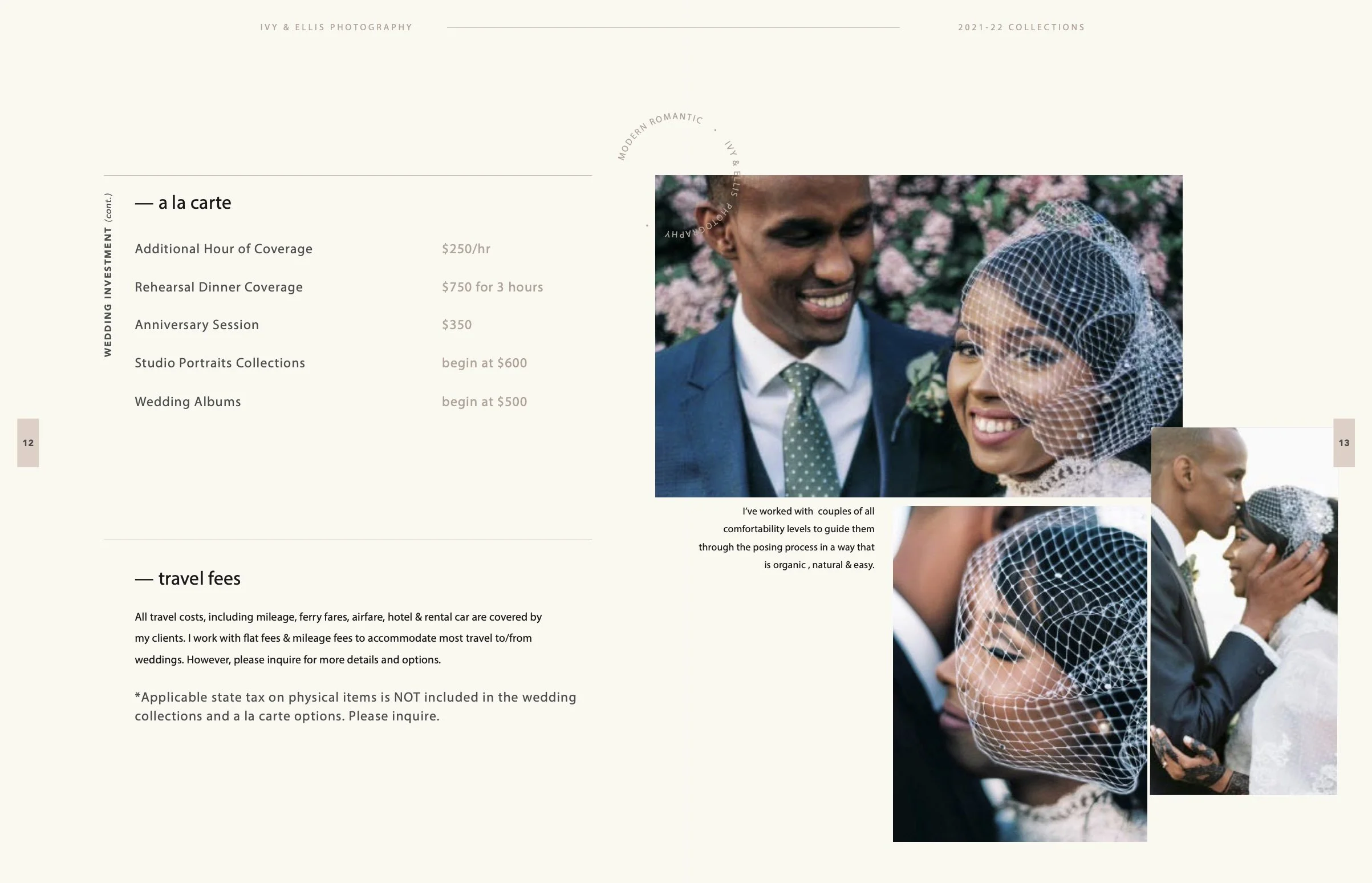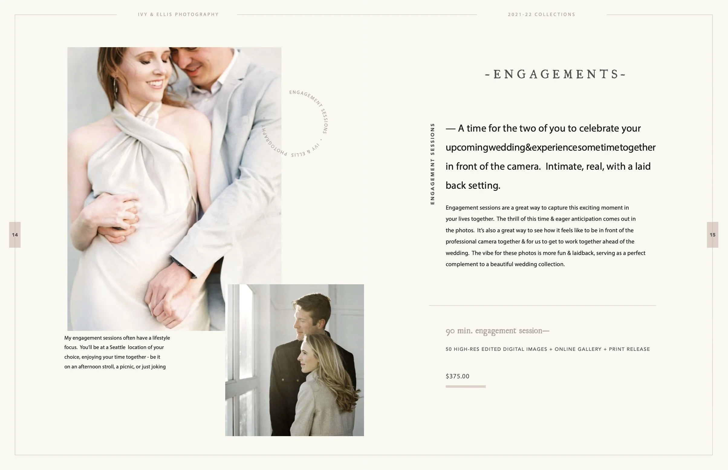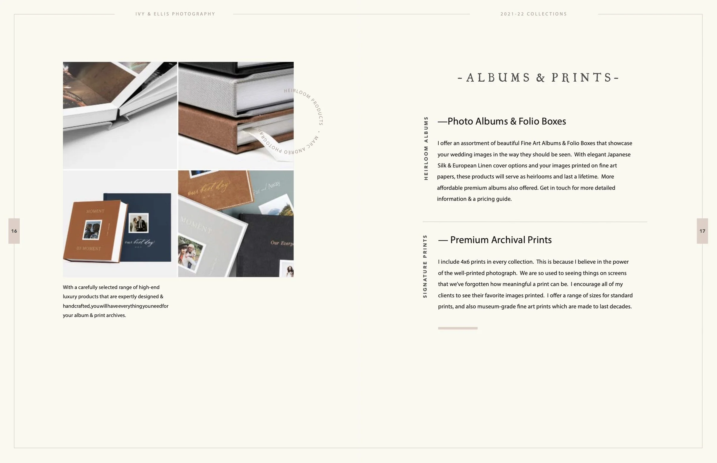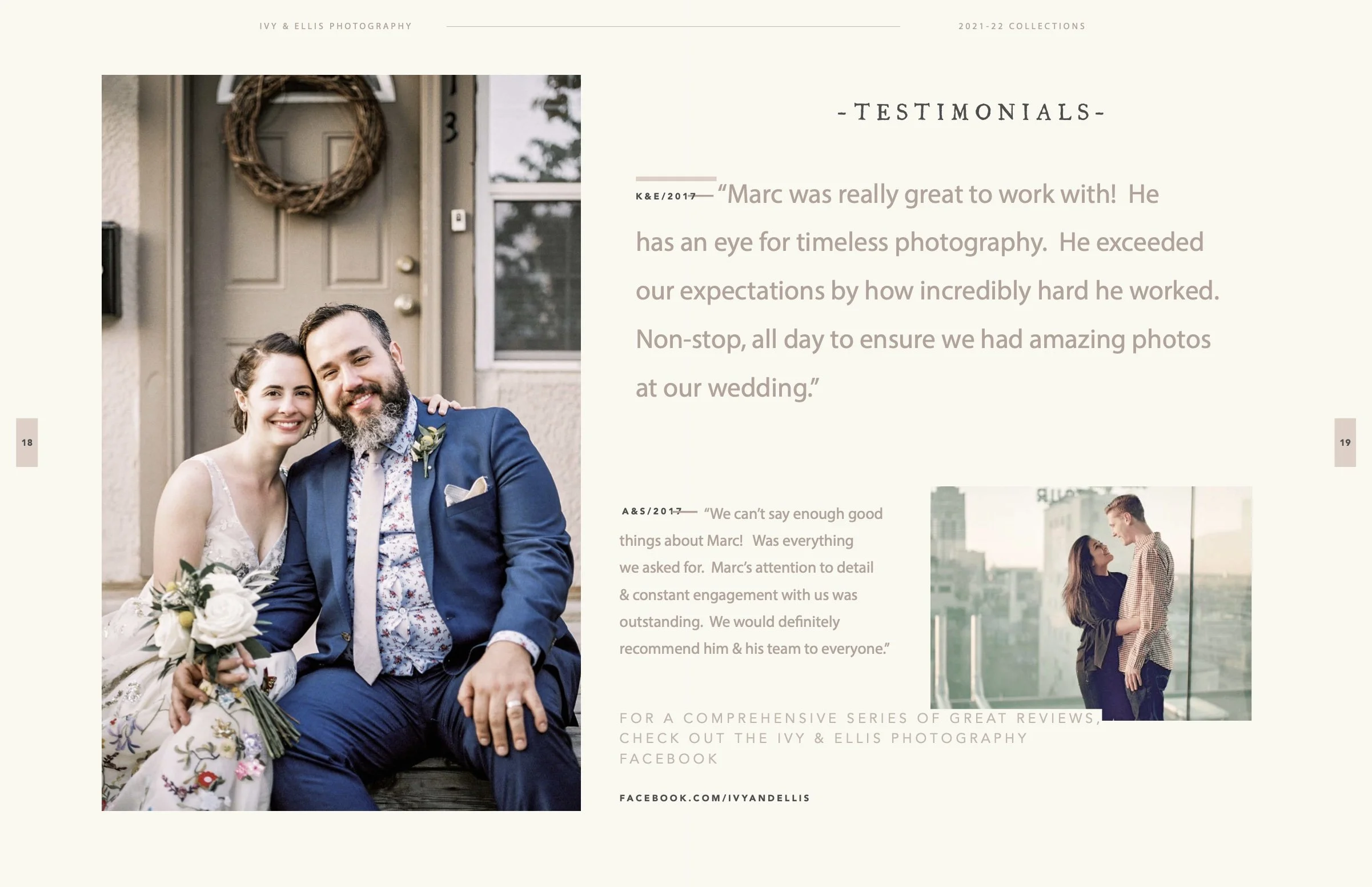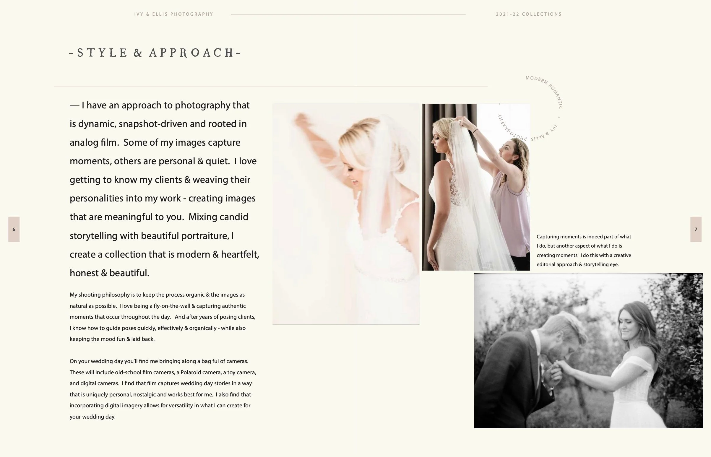 For nearly a decade I worked as a wedding photographer. The business I created was called Ivy & Ellis Photography and my visual design focus was ephemeral film photography that captured honest moments and snapshots, with a visual design that emphasized a clean, modern and elegant look