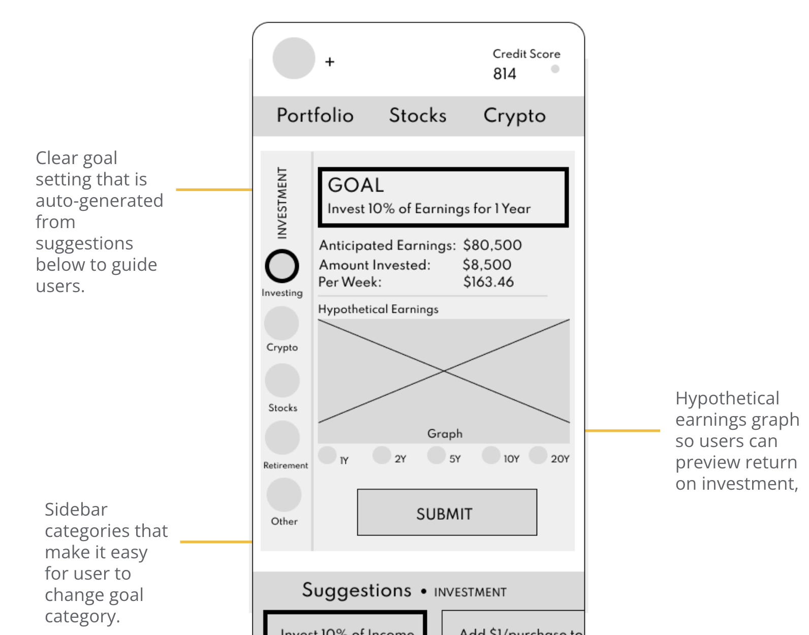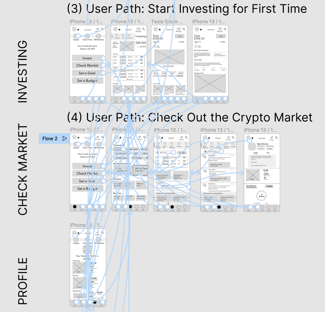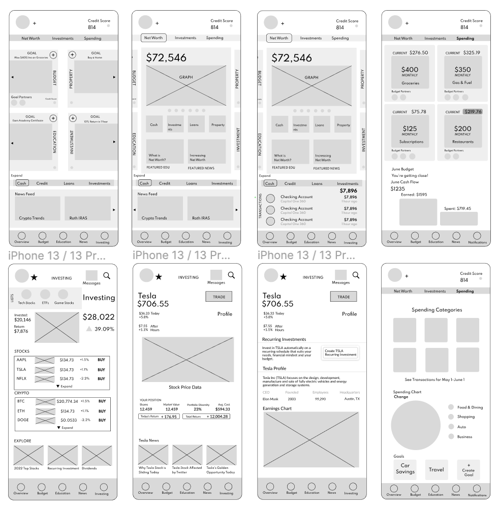 Taking the time to draft iterations of each screen of the app on paper ensured that the elements that made it to digital wireframes would be well-suited to address user pain points. For the home screen, I prioritized a quick way for users to check investments.