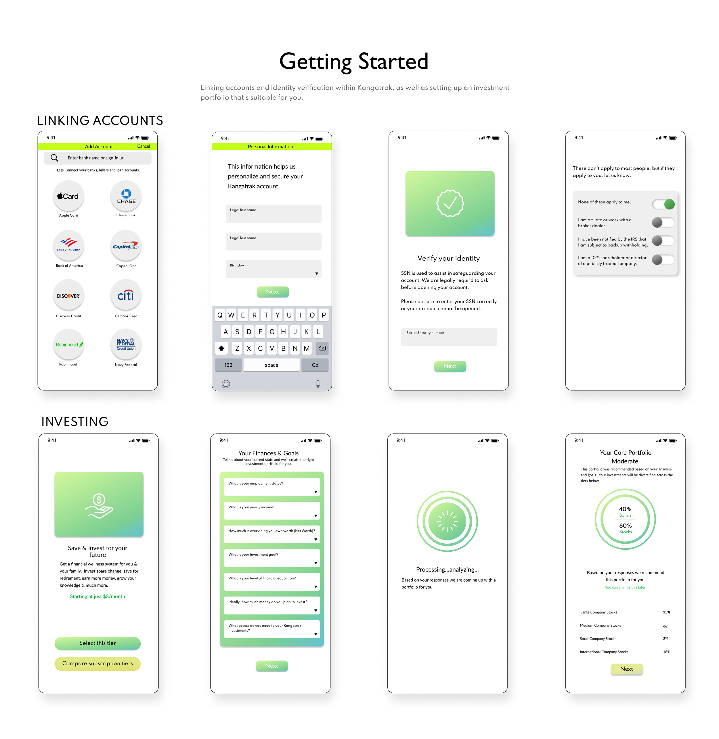 The final high-fidelity prototype presented cleaner user flows for getting started with investing. It also met user needs for an app more focused on investing and for guidance within the navigation.