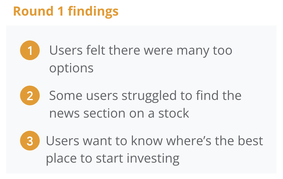 I realized after the 1st round that I would have to refine my target user base - I decided to focus on 1st time young investors. The app could cater to more experienced investors, but for the purposes of the study my focus was on those new to investing.