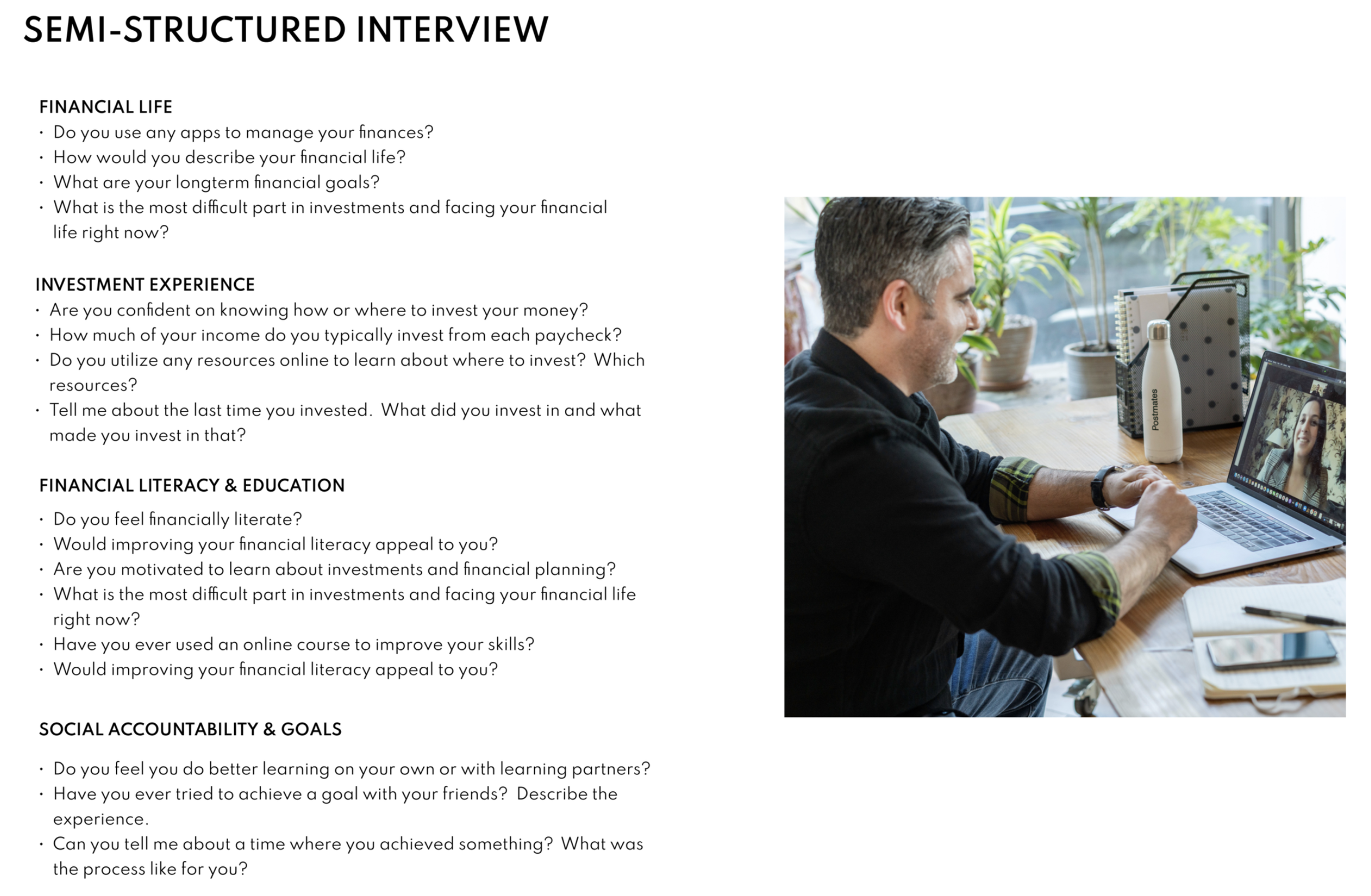 I conducted white paper research and semi-structured user interviews to understand the needs of the users I am designing for. A primary user group identified through research was working young adults aged 21-41 who have little or no experience with investing.