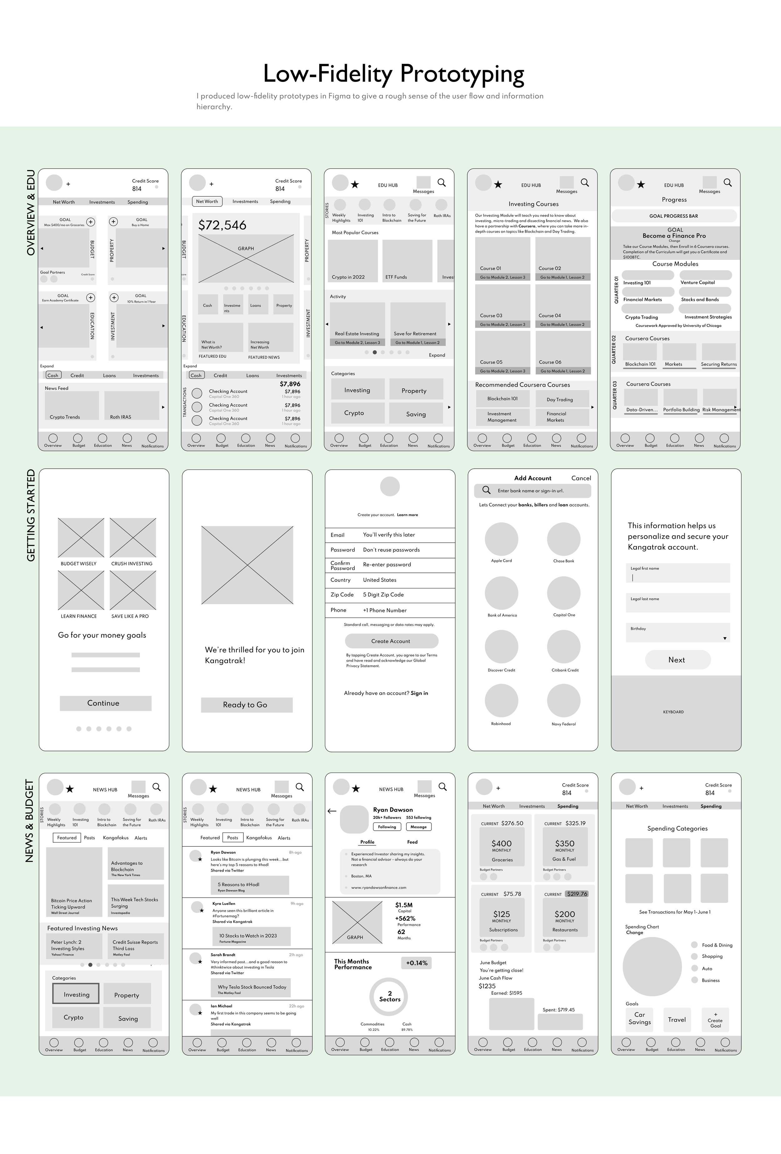 I tried to keep the wireframes straightforward, clearly giving important information, while also educating newer users and providing more detailed info to more experienced users.