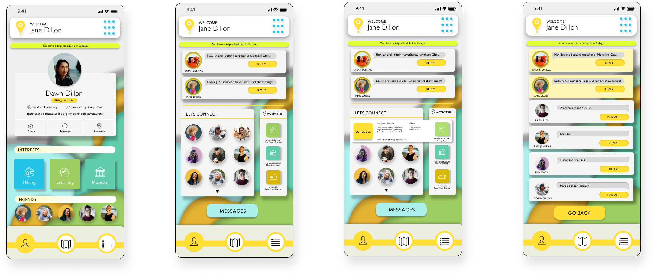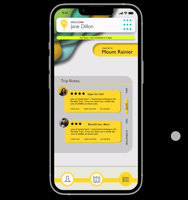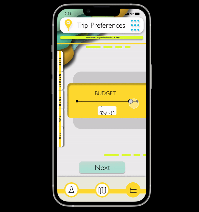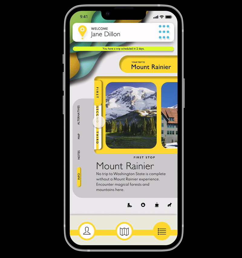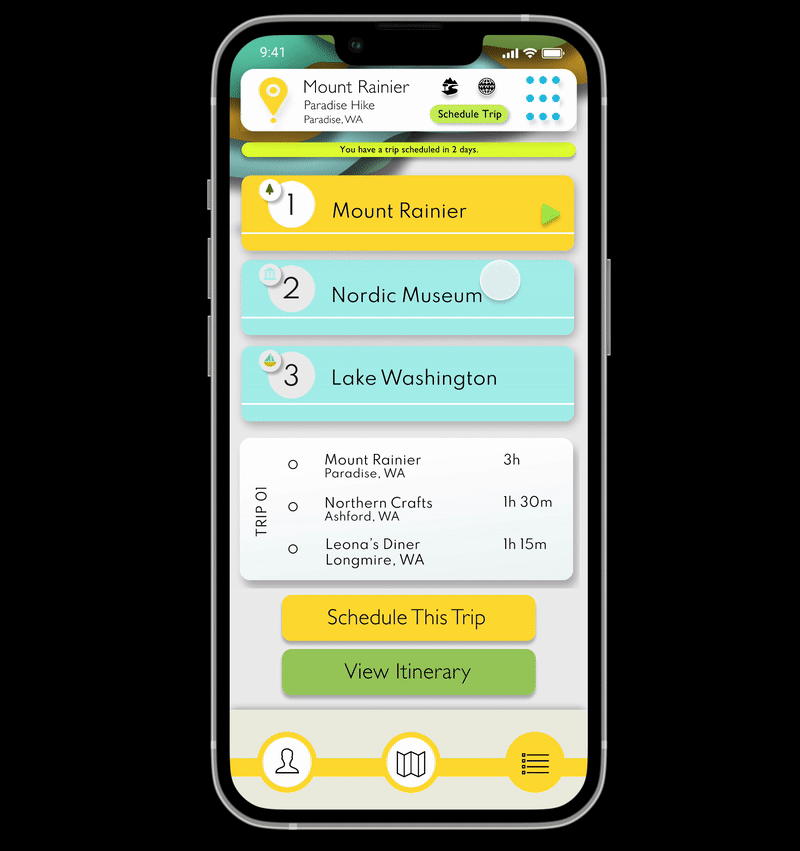 Inspired by my own day trip experiences, I researched trip planning and work/life balance behaviors to arrive at an app-based tool geared towards helping individuals plan and execute day trips as part of a wellness routine.