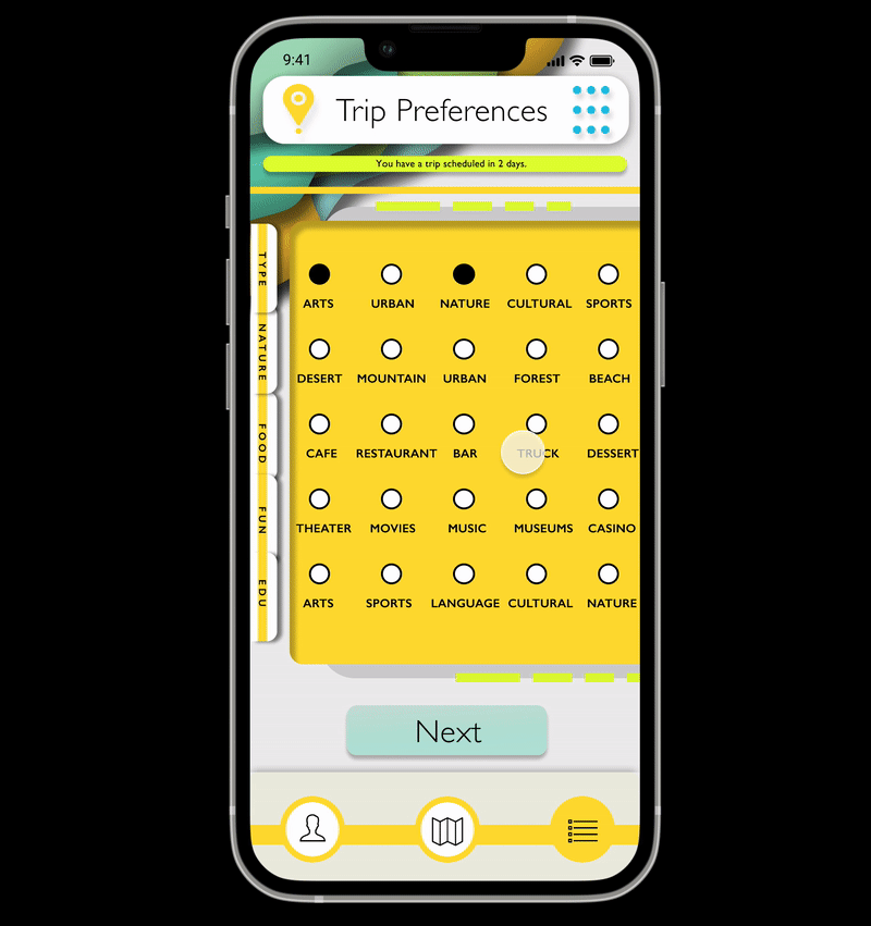 Using principles of color psychology, I chose an activating bold hue for the brand color. This was to generate warmth and guide the user through the app. Also, yellow is one of the colors that is popularly used in the arena of travel apps.